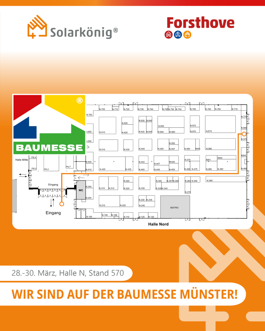 Vom 28. bis zum 30. März 2025 sind wir auf der Baumesse Münster vertreten und freuen uns darauf, Sie rund um Photovoltaik, Speicherlösungen, Wärmepumpen und E-Mobilität zu beraten. Sie finden uns in Halle N, Stand 570.