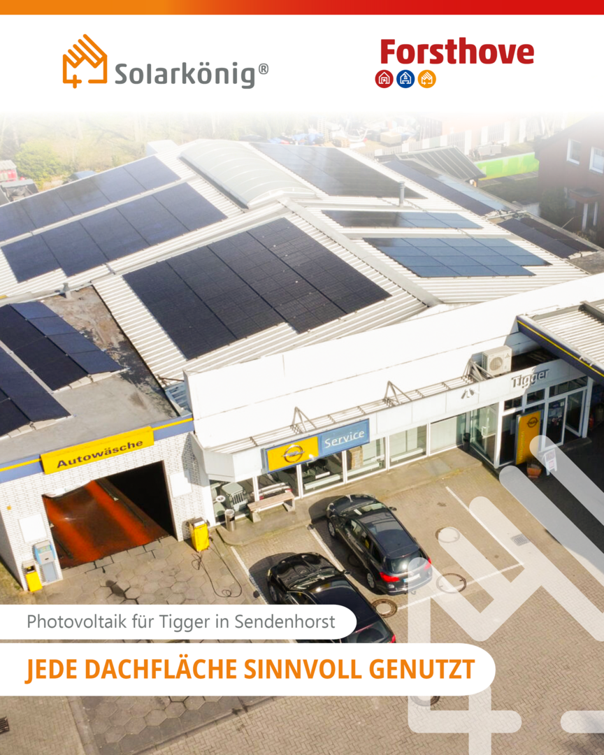 Am Standort der Firma Tigger in Sendenhorst haben wir eine PV-Anlage mit einer Gesamtleistung von 70,40 kWp umgesetzt – ausgelegt auf den Eigenverbrauch für Zapfsäulen, Werkstatt und Autowaschanlage. Damit wird der Strom dort genutzt, wo er entsteht. Die Anlage liefert künftig einen durchschnittlichen Jahresertrag von rund 59.558 kWh.