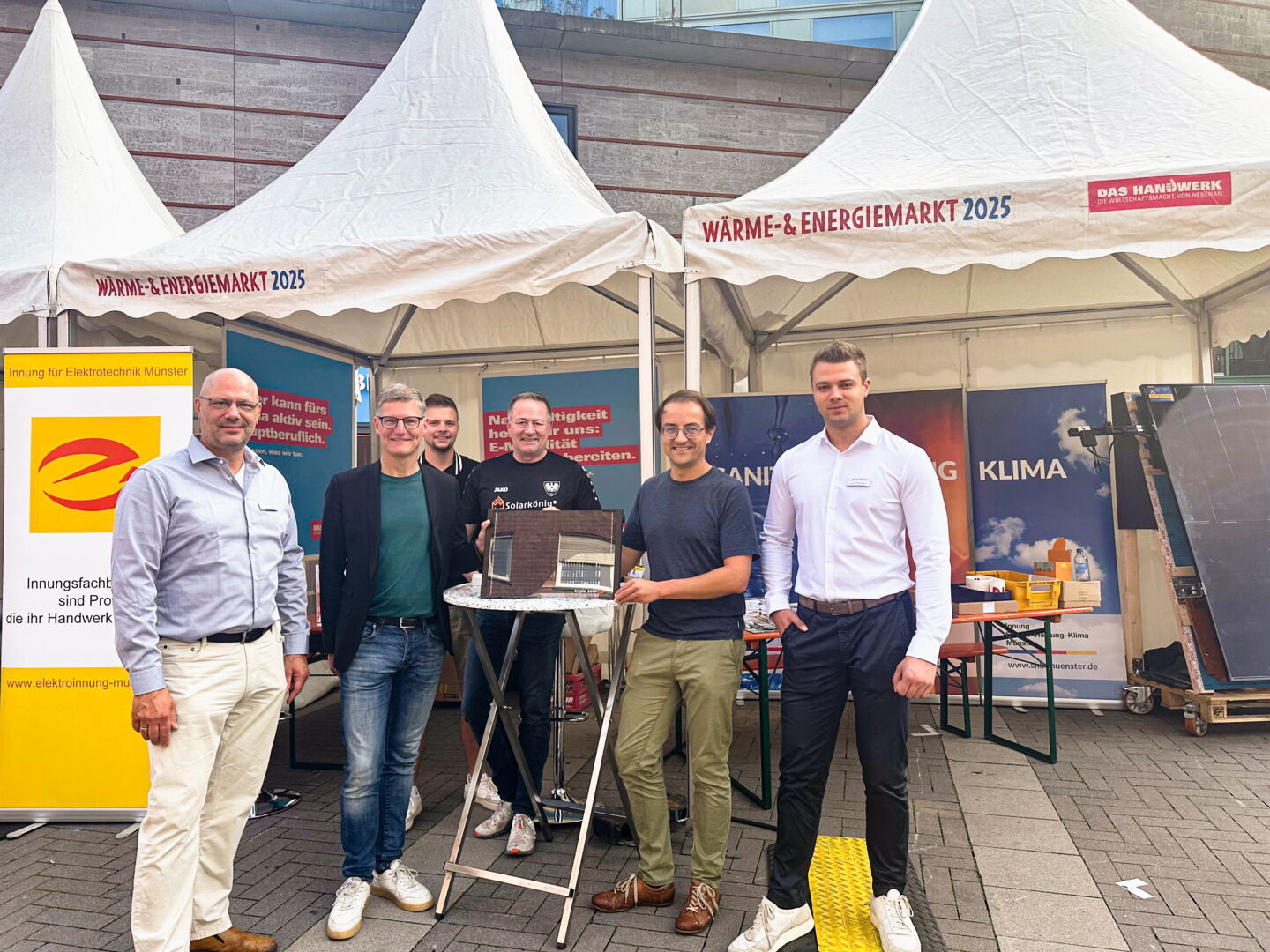 Wir waren am Samstag, 20.09.2025, als Aussteller in der Innenstadt von Münster vor Ort. Am Stand führten wir viele Gespräche zu Photovoltaik, Speichern, Wallboxen, Energiemanagement sowie zur Abstimmung mit Wärmepumpen. Besondere Station des Tages: der Besuch von Oberbürgermeisterkandidat Tilman Fuchs (Grüne). Wir haben uns über Chancen der energetischen Sanierung in Münster, Fachkräfte im Handwerk und den Ausbau erneuerbarer Energien ausgetauscht. Unser Dank gilt der Handwerkskammer Münster für die Organisation.