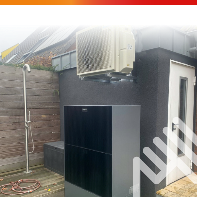 Das Konzept umfasst eine Luft-Wärmepumpe mit Pufferspeicher und Trinkwasserstation, die zur Nutzung überschüssiger Solarenergie optimiert ist. Die vorhandene Solarthermieanlage wurde dabei vollständig in das System integriert, sodass eine maximale Energieeffizienz erreicht wird. Die Montage erfolgte unter beengten Platzbedingungen, konnte aber ohne Vergrößerung der ehemaligen Technikflächen realisiert werden. Auch eine Wallbox für die E-Mobilität ist Teil der Anlage und stellt sicher, dass die Haushalts- und Fahrzeugenergieversorgung vollständig durch erneuerbare Energien gedeckt werden kann.
