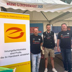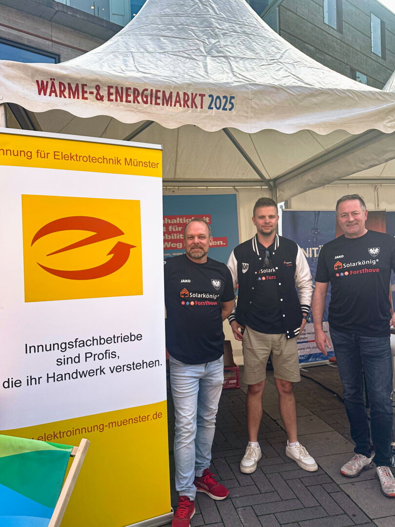 Wir waren am Samstag, 20.09.2025, als Aussteller in der Innenstadt von Münster vor Ort. Am Stand führten wir viele Gespräche zu Photovoltaik, Speichern, Wallboxen, Energiemanagement sowie zur Abstimmung mit Wärmepumpen. Besondere Station des Tages: der Besuch von Oberbürgermeisterkandidat Tilman Fuchs (Grüne). Wir haben uns über Chancen der energetischen Sanierung in Münster, Fachkräfte im Handwerk und den Ausbau erneuerbarer Energien ausgetauscht. Unser Dank gilt der Handwerkskammer Münster für die Organisation.